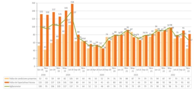La principal caída se da en el Índice de Condiciones Presentes con 45 puntos, y se ubica como el segundo peor entre las 24 mediciones, solo comparable con noviembre 2018 que también era un momento muy afectado por la sequía.