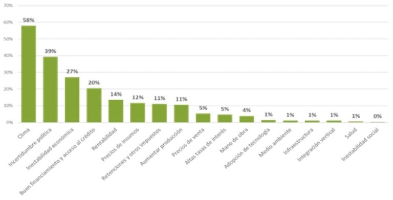En orden de relevancia, las causas de este pesimismo y desaliento de los productores, tanto en actividades agrícolas como ganaderas, son: climáticas, los mercados y precios agrícolas y ganaderos, la incertidumbre política en la Argentina y la inestabilidad macroeconómica global y local.