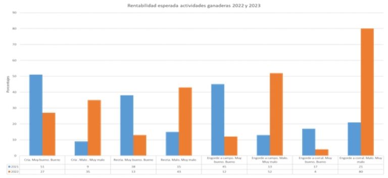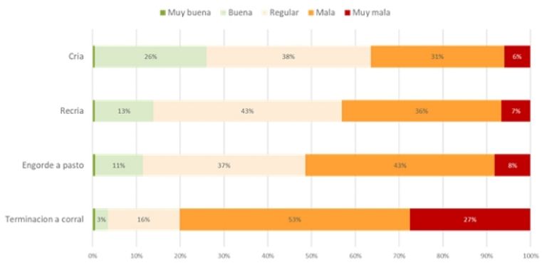 En las explotaciones de cría en la actualidad un 27 % estiman rentabilidad muy buena/buena frente a un 35 % muy mala/mala. En las actividades de recría, un 13 % como Muy buena/buena frente a un 43 % muy mala/mala. En invernada pastoril, 12 % Muy buena/Buena frente a un 52 % Muy mala/mala. Los peores números se dan en engorde a corral/feedlot: 4 % Muy buena/buena, frente a un 80 % Muy mala/mala.