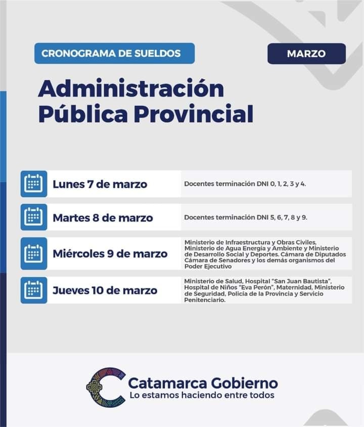 miércoles, 2 de marzo de 2022 13:28 miércoles, 2 de marzo de 2022 13:28 Desde el lunes 7, y hasta el jueves 10, el total de la administración pública estará cobrando sus haberes del mes de Enero de 2022. Ver el detalle en la foto.