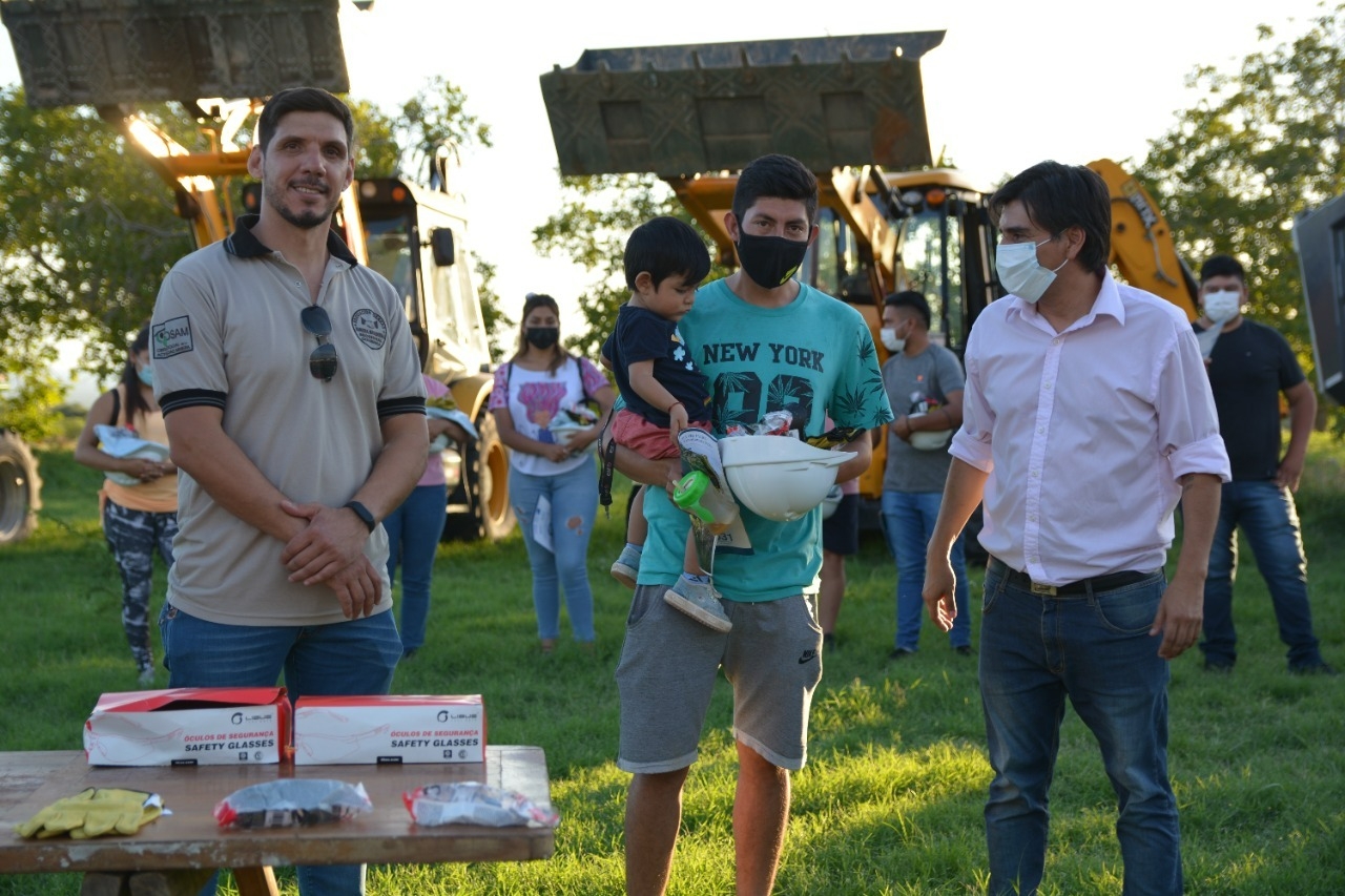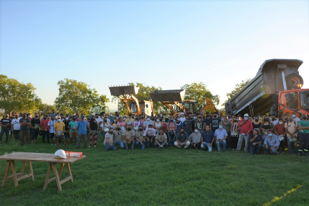 El evento concluyó con la entrega simbólica de los elementos de protección personal que recibirán todos los vecinos al iniciar los cursos, y con una foto grupal con los equipos pesados de fondo.