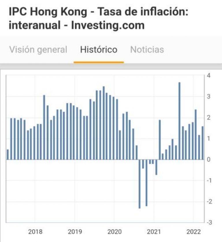 Miren esta belleza de inflación. Mientras el mundo tiene la inflación mas alta en décadas, Hong Kong tiene menos de 2%, e incluso tuvieron deflación hace poco.