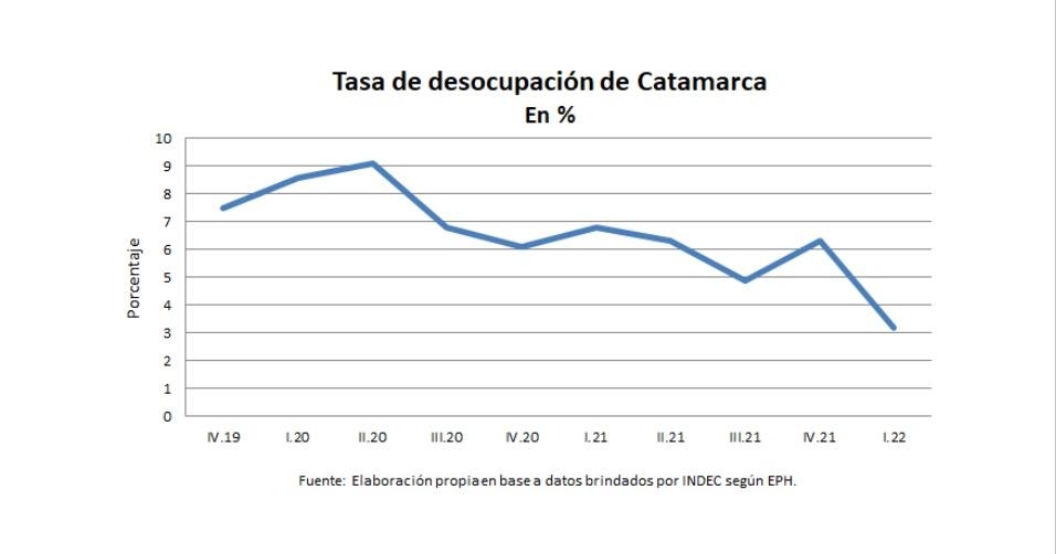 Según el informe técnico “Encuesta Permanente de Hogares. Mercado de Trabajo. Tasas e indicadores socioeconómicos” del INDEC publicado en junio 2022, en base a la Encuesta permanente de Hogares (EPH), la tasa de desocupación -es decir las personas que no tienen ocupación, están disponibles para trabajar y buscan empleo activamente- en el Gran Catamarca para el primer trimestre del 2022 fue de 3,2%.