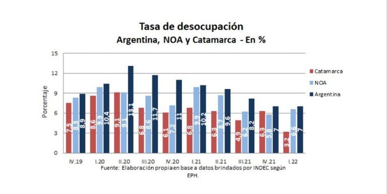 Este número posiciona a Catamarca por debajo del promedio de los últimos tres años en la provincia y representa el menor nivel de los últimos tres años. Esto representa una caída en el desempleo de 3,1 puntos porcentuales respecto al último trimestre de 2021 y de 3,6 puntos porcentuales respecto al primer trimestre de 2021.