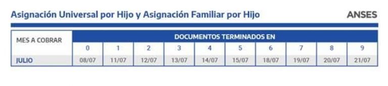 ANSES informa el calendario de pagos de julio para jubilados, jubiladas, pensionados y pensionadas, Pensiones No Contributivas, titulares de la Asignación Universal por Hijo y la Asignación por Embarazo, Asignaciones Familiares y de Pago Único (Matrimonio, Nacimiento y Adopción) y Prestación por Desempleo.