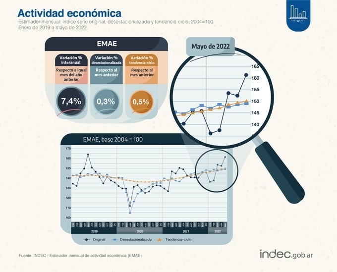 De esta manera, el Estimador Mensual de la Actividad Económica (EMAE) acumuló en los primeros cinco meses un incremento del 6,2% en relación a igual lapso de 2021.