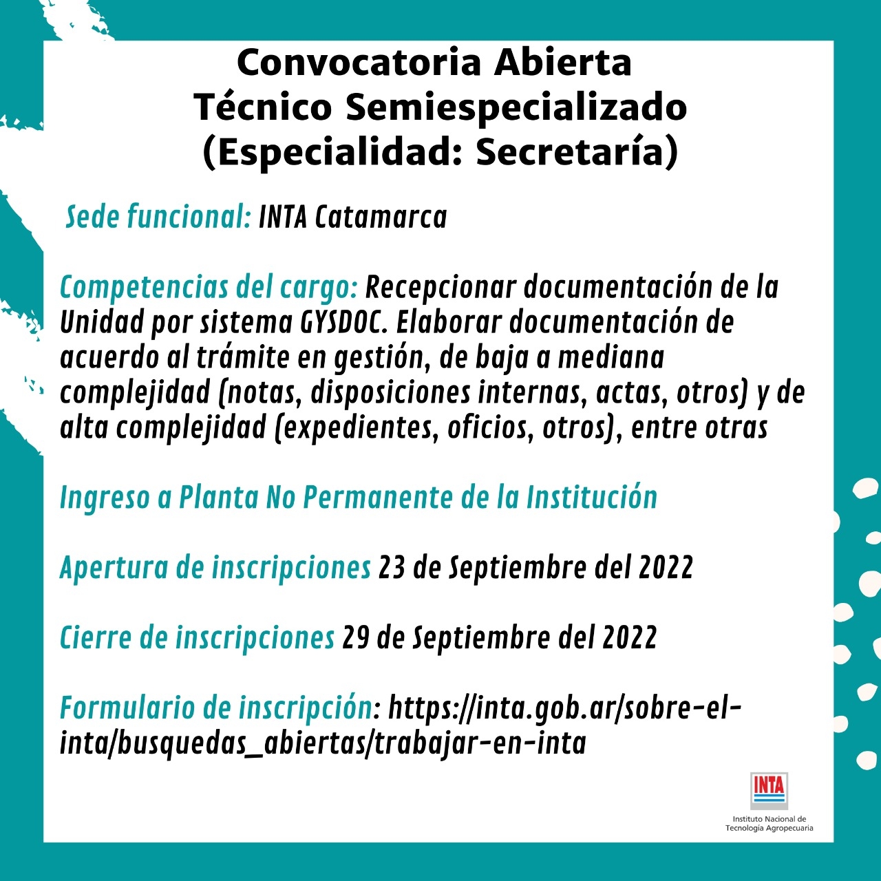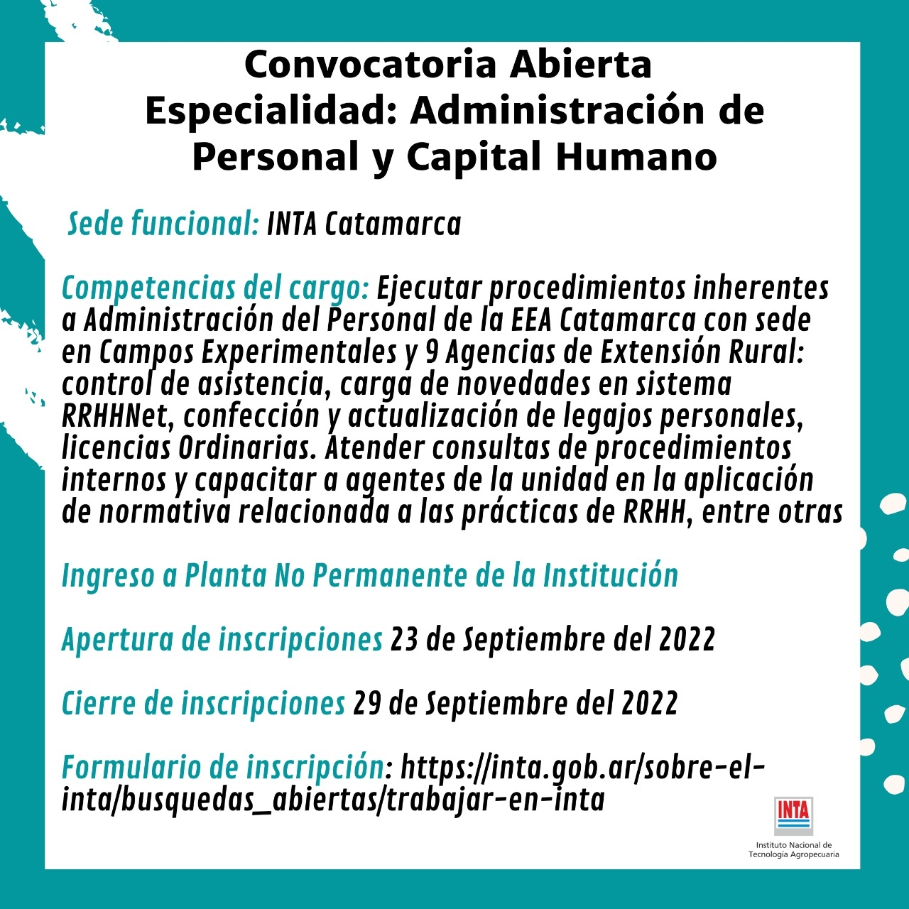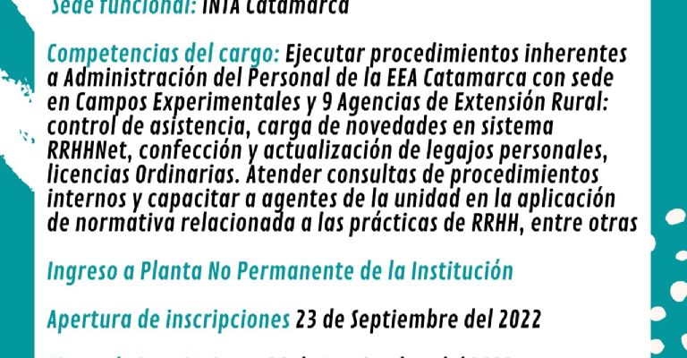 Para el cargo se requieren competencias como ejecutar procedimientos inherentes a Administración del Personal de la EEA Catamarca con sede en Campos Experimentales y 9 Agencias de Extensión Rural: control de asistencia, carga de novedades en sistema RRHHNet, confección y actualización de legajos personales, licencias Ordinarias, Especiales y transferencia, Altas por ingresos de becarios, PNP y PP y bajas por jubilación y/o fallecimiento. Atender consultas de procedimientos internos y capacitar a agentes de la unidad en la aplicación de normativa relacionada a las prácticas de RRHH. Participar en procedimientos vinculados a normativa de H y S Laboral, articular con ART: atención y seguimiento en todos los casos que lo requieran, entre otros. Los interesados en participar del proceso de selección deberán acceder al siguiente link para visualizar requisitos y formulario a descargar: https://convocatorias.inta.gob.ar/formularios/frmDetalle.aspx?id=1190&v=2