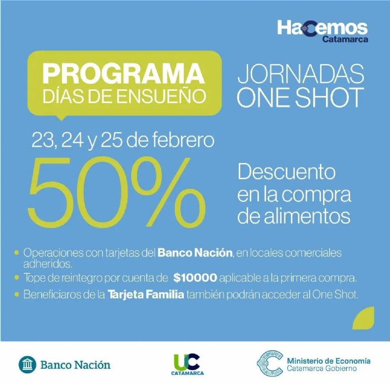 Durante los días jueves 23, viernes 24 y sábado 25 de febrero, se desarrollarán las Jornadas One Shot, con el descuento de un 50% en alimentos para las compras que se efectúen con las tarjetas de crédito del Banco de la Nación Argentina, en el marco de Días de Ensueño.