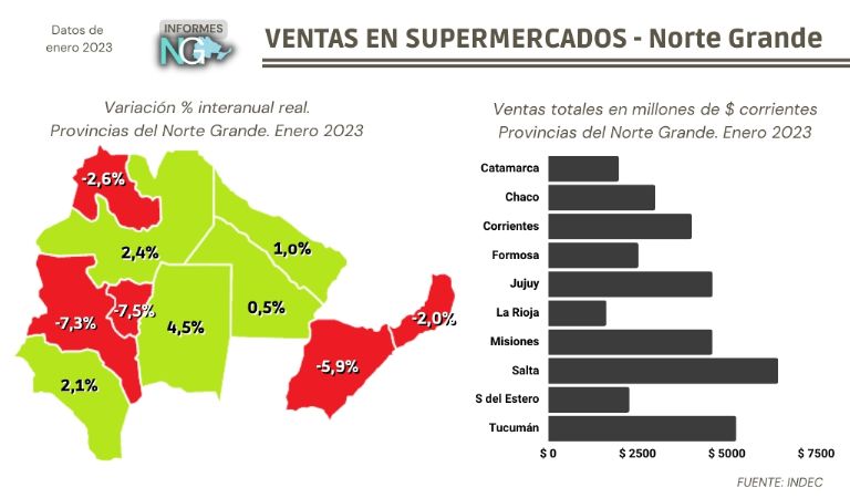 En lo referido a sus desempeños, el rubro de Bebidas tuvo un incremento consolidado del 11,4% en el Norte Grande, a partir del hecho de que las diez provincias mostraron subas, con pico en Chaco (+38,2%). En el rubro de Almacén se observa una suba del 4,3% real en la región consolidada con seis provincias mostrando subas (pico en Salta) y cuatro con descensos (la mayor en Tucumán).