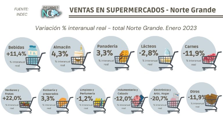 Al analizar los desempeños interanuales reales por grupo de artículos, en enero de 2023 fue Verduras y Frutas el que tuvo el mayor incremento real (24,9%), siendo un rubro con una participación relativamente minoritaria en el total de ventas (4,9%). Junto a este, otros cinco también tuvieron alzas reales: Alimentos preparados y rotisería (13,3%), Bebidas (12,1%), Panadería (7,4%), Almacén (3,7%) y Artículos de Limpieza y perfumería (1,3%).