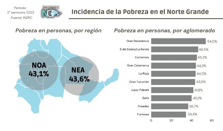 Los niveles de pobreza e indigencia tuvieron una suba al segundo semestre del 2022 en todo el país. A nivel regional, las regiones que conforman el Norte Grande argentino exhibieron las mayores tasas de pobreza: el NEA lideró con el 43,6% de personas en esa situación, mientras que el NOA quedó segunda con el 43,1%. Además, son las únicas dos regiones donde esta tasa superó el 40%. Algo más atrás quedaron Cuyo con 39,6%, el GBA con 39,5%, la Pampeana marcó 36,3% y la Patagonia 34,7%. El total nacional se ubicó por encima de estas dos últimas.