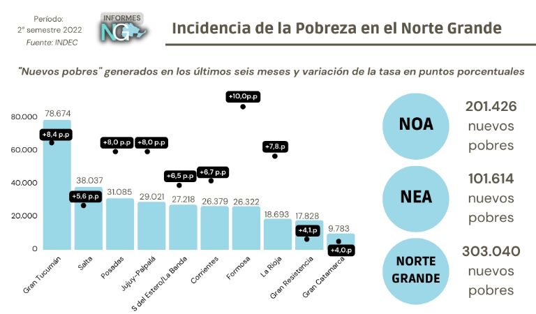Observando en población, en el NEA las personas en situación de pobreza totalizan 631.847, unas 101.614 más que en el semestre anterior; en el NOA, la población pobre totalizó 1.203.455 personas y se incrementó en 201.426 en el último semestre. Por ende, en todo el Norte Grande consolidado hay 303.040 nuevos pobres en relación con el primer semestre de 2022.