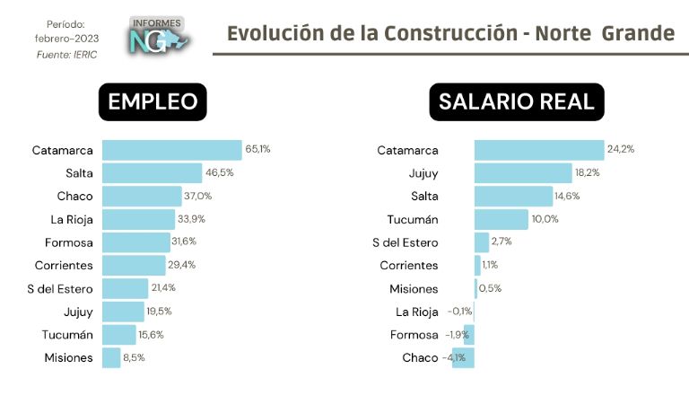 En febrero del 2023, el sector de la construcción en el país exhibió una suba del 16,4% en comparación contra igual mes del 2022, logrando generar 61.115 empleos en ese período. En este marco, la región del Norte Grande continúa presentando las mayores subas relativas entre las regiones del país. A nivel consolidado, la macrorregión exhibe una suba del 28% interanual logrando crear 16.644 empleos; hacia adentro de la misma, el NOA lideró con 30,3% (10.573 empleos) y el NEA creció 24,7% (6.071). De ese modo, el Norte Grande explicó 27% de los puestos de trabajo creados en los últimos doce meses del país.