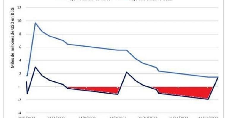 “Para comprender la situación actual de Argentina, es fundamental entender la importancia de un mayor desembolso. Ante una grave sequía que ha disminuido significativamente los ingresos de divisas, la actual administración busca incrementar el flujo de fondos para aumentar las reservas internacionales brutas. Por otro lado, si no se obtiene un adelanto de fondos por parte del FMI, el gobierno comenzará devolver momentáneamente el préstamo a partir de julio, utilizando dólares de las reservas netas, como se muestra en el cuadro anterior”.