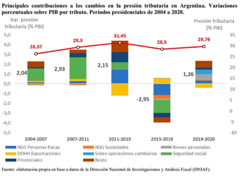 Respecto a los cambios de Gobierno entre 2004 y 2020, la presión tributaria no varió en más de un 5%. Esto lo deja en una tasa promedio del 29,05% en esos 16 años. Hubo variaciones en la estructura tributaria pero no en el peso de los impuestos sobre la sociedad.