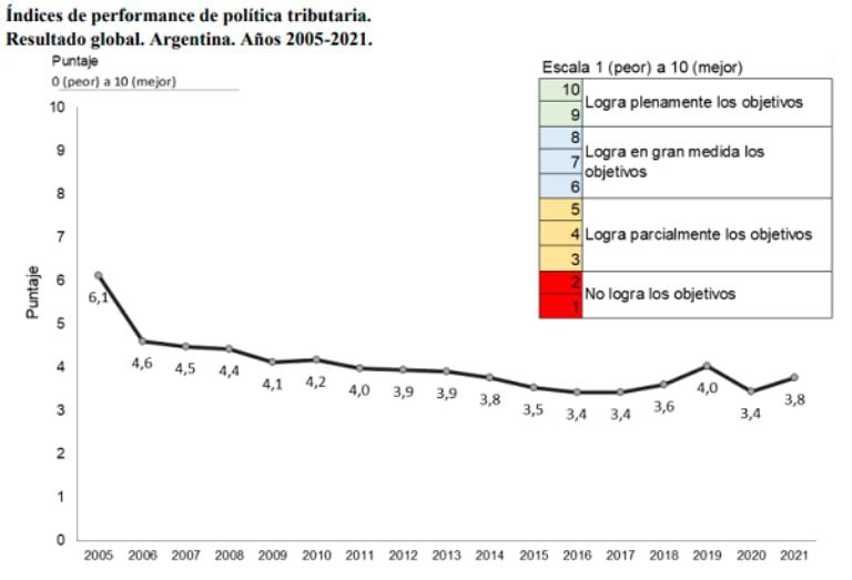 Argentina perdió 2,3 p.p. de eficiencia de performance de política tributaria en los últimos 18 años. Se trata de la calificación de la estructura impositiva y su funcionamiento. En 2005, se encontraba en un 6,1% y en 2021 llegó al 3,8%. El país está cerca de ingresar en zona de “no logra los objetivos” en torno al sistema impuesto y su recaudación efectiva. En los Gobiernos del 2004 al 2020, la presión tributaria no sufrió grandes variaciones. El punto mínimo fue 26,37% en 2007 y el máximo, 31,45% en 2015. Se mantuvo en un promedio del 29,05%.