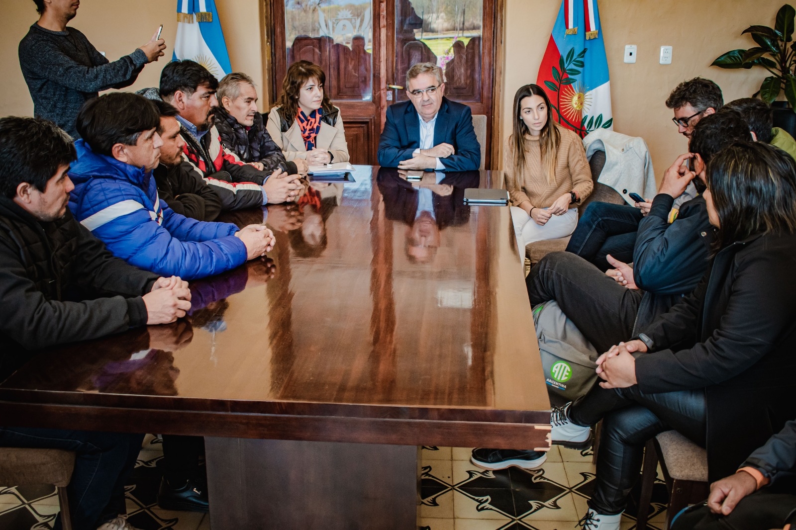 Durante la reunión estuvieron presentes las ministras de Trabajo, Planificación y Recursos Humanos, Verónica Soria; de Economía, Alejandra Nazareno; Ricardo Árevalo (ATE), Claudia Espeche (UPCN), y secretarios gremiales de los municipios.
