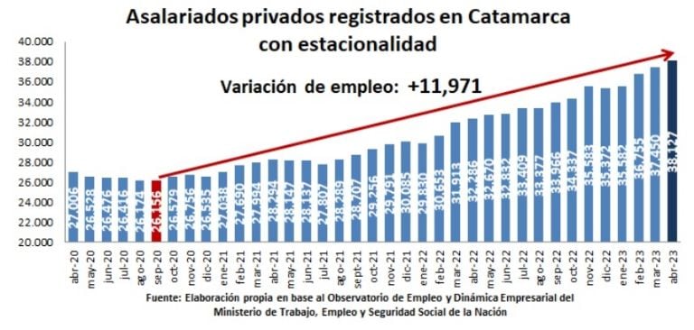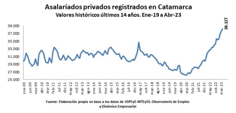 Con datos a abril de 2023, se evidencia que Catamarca experimentó una variación interanual del 18,3%, que dejó un número total de 38.127 trabajadores asalariados privados. Este número es el máximo histórico para los últimos catorce años en la provincia en lo que respecta a empleo privado registrado.