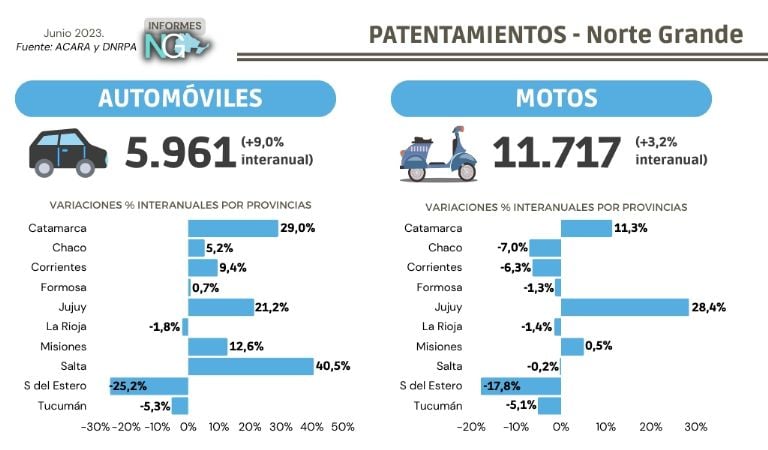 El total de automóviles patentados en el Norte Grande durante junio fue de 5.961 unidades, participando del 15% del total nacional. En relación con igual mes del 2022 presentaron una expansión del 9,0% aunque, desagregando por región, fue el NOA el que tuvo una expansión más significativa (10% vs. 7,7% del NEA).
