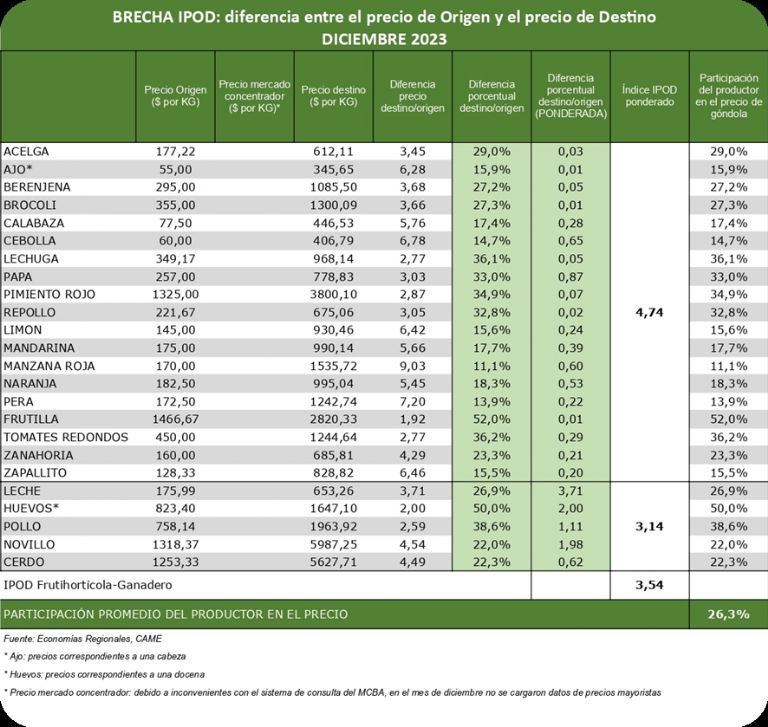 IPOD frutihortícola: del campo a la góndola, los precios de las 19 frutas y hortalizas que integran la canasta IPOD se multiplicaron por 4,7 veces en diciembre.
