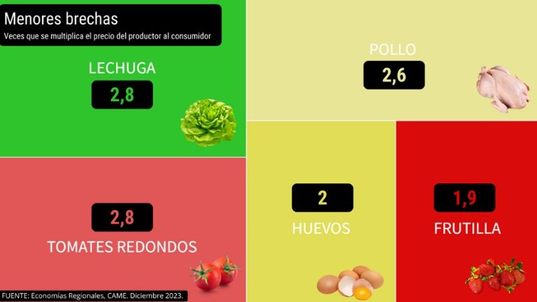 Entre los productos que presentaron menor diferencia entre el precio que recibió el productor y el que pagó el consumidor se encuentran cuatro frutihortícolas y uno de origen animal.