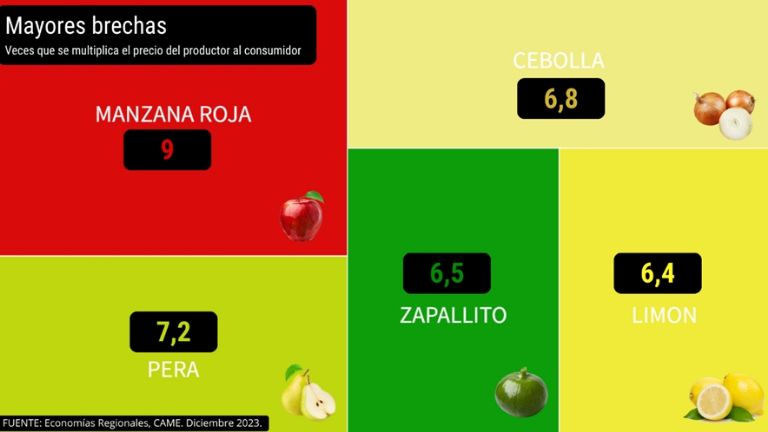 La manzana roja (9 veces), la pera (7,2), la cebolla (6,8), el zapallito (6,5) y el limón (6,4) fueron los cinco productos que presentaron mayores diferencias entre los precios de origen y de destino.