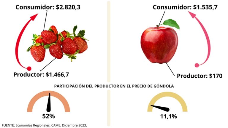 En promedio, la participación del productor explicó el 26,3% de los precios de venta final. La mayor participación la tuvieron los productores de frutilla (52%), mientras que la menor fue para los de manzana roja (11%).