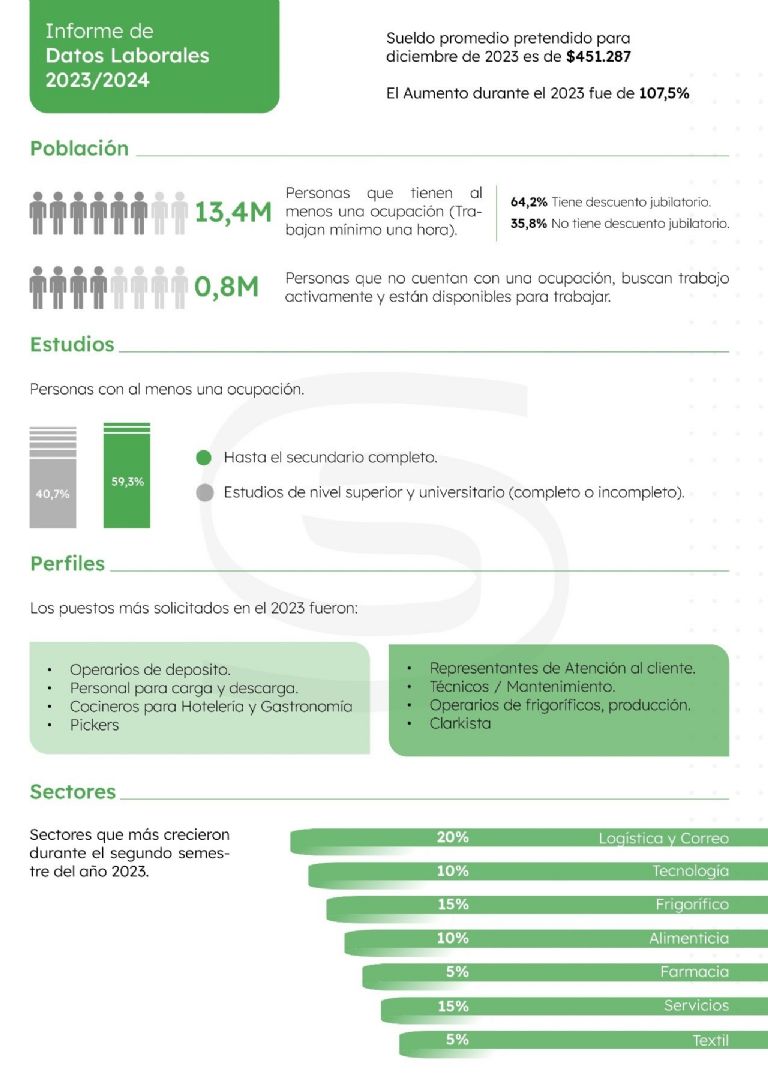 En cuanto a las industrias que más crecieron durante el segundo semestre de 2023 y que mayor cantidad de búsquedas registraron se destacan logística y correo (20%); tecnología (10%); frigorífico (15%); alimenticia (10%); farmacia (5%); servicios (15%), y textil (5%). Los sectores con mayor expansión del volumen de avisos fueron: gastronomía y turismo; logística y producción: minería; petróleo y gas, y atención al cliente.