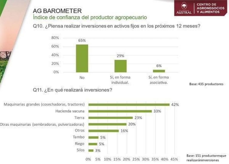 Del 35% de los productores que realizarán inversiones, la gran mayoría lo hará de forma individual (29%) y los rubros elegidos son: maquinarias grandes (42%), hacienda vacuna (33% y principalmente de cría), tierra (23% porque los valores están relativamente bajos) y otras maquinarias (20% en sembradoras y pulverizadoras, entre otras).