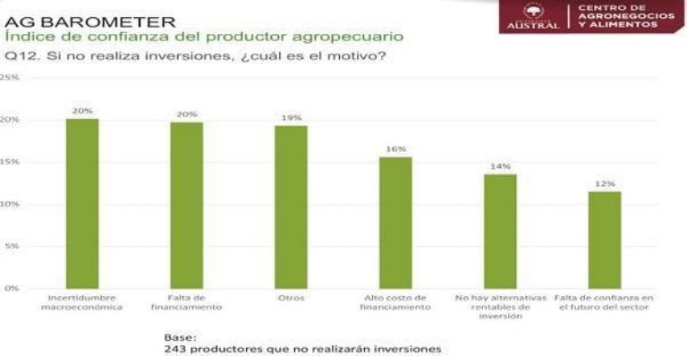 La última medición del Índice de Confianza del Productor Argentino “Ag Barometer Austral”, que elabora el Centro de Agronegocios y Alimentos de la Universidad Austral, revela que, por la incertidumbre económica, el 61% de los productores no piensa invertir en activos fijos en los próximos 12 meses. Otros factores que se suman al poco incentivo en inversiones para el campo son la falta de financiamiento, o alto costo del mismo.