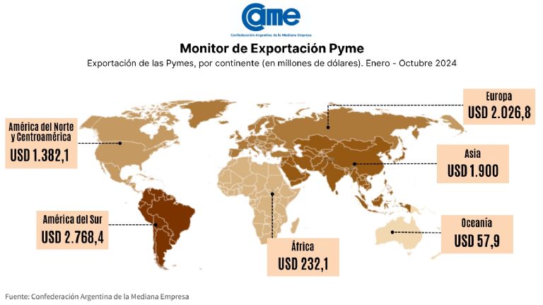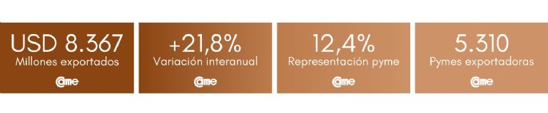 Así surge del Monitor de Exportación Pyme (MEP), un indicador elaborado por el sector de Estadísticas e informes de la Confederación Argentina de la Mediana Empresa (CAME) para medir las exportaciones de las pequeñas y medianas empresas de la República Argentina, en base al monitoreo mensual de las operaciones de las empresas nacionales en el comercio exterior. Se discrimina por su condición pyme declarada ante la Secretaría de la Pequeña y Mediana Empresa, Emprendedores y Economía del Conocimiento, dependiente del Ministerio de Economía de la Nación.