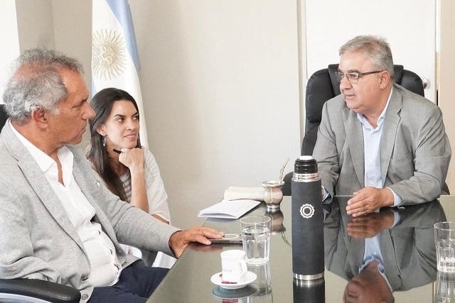 El secretario de Turismo, Ambiente y Deportes, Daniel Scioli, recibió hoy al gobernador de Catamarca, Raúl Jalil, para avanzar en temas vinculados con Turismo y Ambiente, entre ellos, cómo lograr un manejo más productivo de la fibra de vicuña que el actual y alcanzar mayores volúmenes de exportación que los registrados hasta ahora.