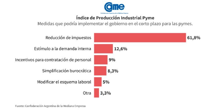 La medida más destacada que esperan las industrias pymes continúa siendo la reducción de impuestos (nacionales y provinciales) y de tasas municipales. Ese reclamo conjunto representa el 61,8% de las respuestas (0,4 puntos porcentuales por encima de octubre). El segundo lugar lo ocupó el estímulo a la demanda interna con 12,6% de respuestas (un punto menos que en el mes previo).