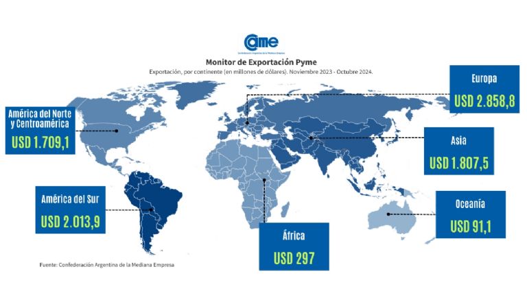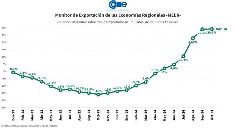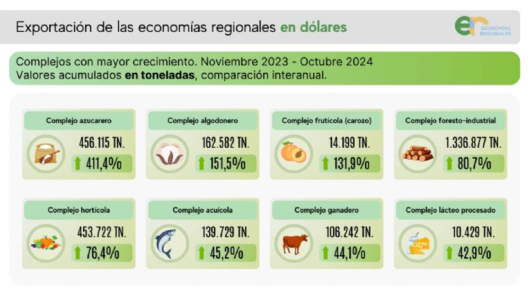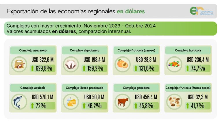 Con este incremento, las exportaciones regionales alcanzaron los USD 8.777 millones exportados en el período noviembre 2023-octubre 2024, habiendo importado USD 914 millones, lo que arroja un superávit comercial de USD 7.863 millones.