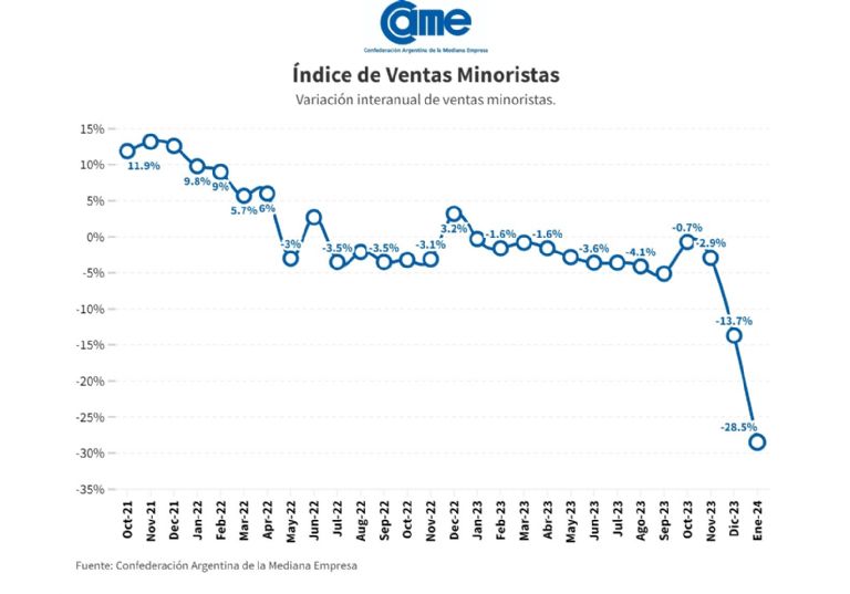 Así surge del Índice de Ventas Minoristas Pymes de la Confederación Argentina de la en Mediana Empresa (CAME), elaborado en base a un relevamiento mensual entre 1.256 comercios minoristas del país, realizado del 1 y 2 de febrero de 2024.