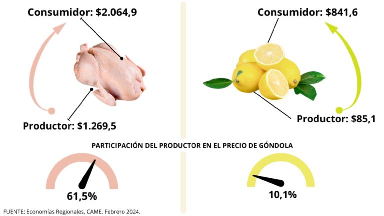 En promedio, la participación del productor explicó el 28% de los precios de venta final. La mayor participación la tuvieron los productores de pollo (61,5%), mientras que la menor fue para los de limón (10,1%).