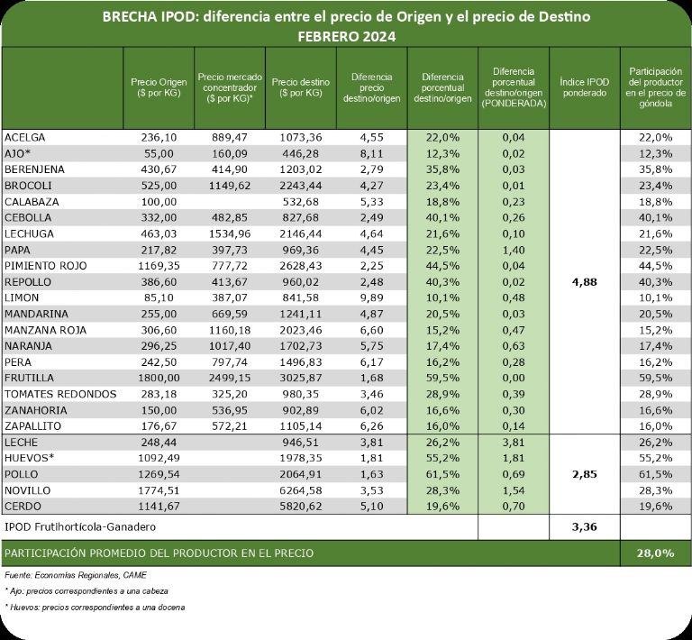 IPOD frutihortícola: del campo a la góndola, los precios de las 19 frutas y hortalizas que integran la canasta IPOD se multiplicaron por 4,9 veces en febrero, lo que representa una disminución del 14,3% con respecto a enero.