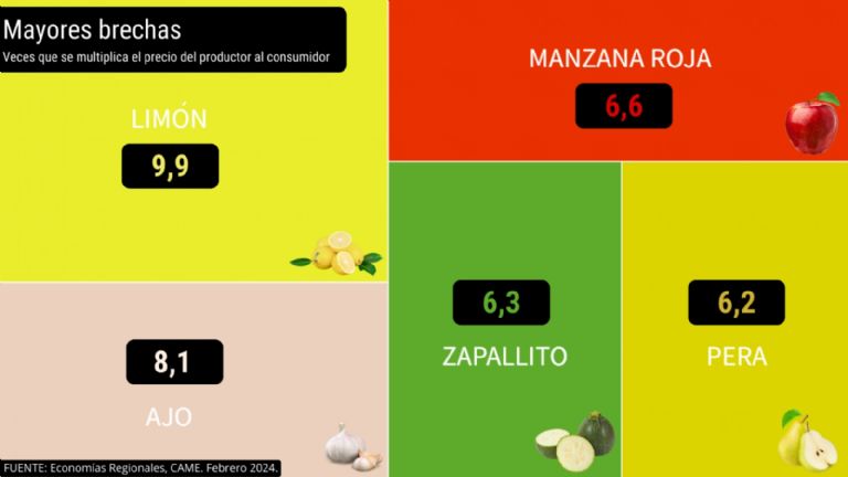 El limón (9,9 veces), el ajo (8,1), la manzana roja (6,6), el zapallito (6,3) y la pera (6,2), fueron los cinco productos que presentaron mayor diferencia entre los precios de origen y destino.