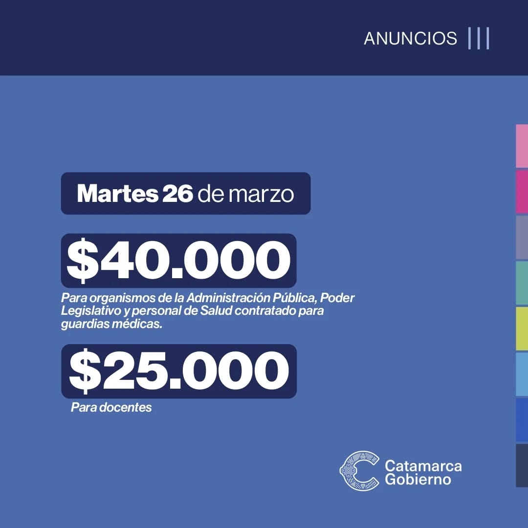 El Ministerio de Economía anuncia que este martes 26 de marzo será depositado el bono de $ 40 mil acordado para este mes con los gremios estatales y que corresponde a los agentes de la Administración Pública Provincial que cobran hasta $ 700.000 en sus haberes. El mismo día percibirán el bono extraordinario del mismo importe los empleados del Poder Legislativo.