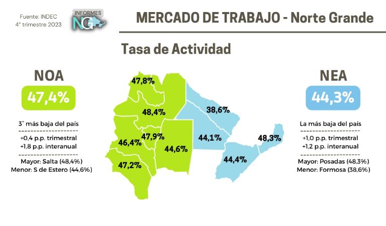 Según el reporte de Mercado de Trabajo publicado por el INDEC, correspondiente al cuarto trimestre 2023 , el NEA y el NOA mostraron mejoras en sus tasas de actividad y empleo, aunque aún exhiben niveles inferiores al total nacional.