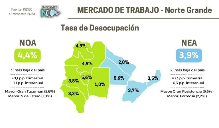 En el NEA la desocupación marcó 3,9% en este período, la segunda más baja del país; en el NOA fue de 4,4%, la tercera más alta aunque por debajo del total nacional.