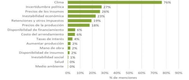 Para los productores agropecuarios, el clima es la mayor preocupación para los próximos 12 meses por encima de los escenarios políticos, económicos y financieros. Esto implica un cambio importante ya que, comparado con el año anterior, los temas económicos y políticos, si bien generan alguna incertidumbre, no se encuentran a la cabeza de las preocupaciones.