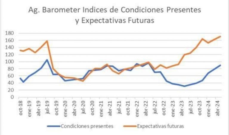 Por otro lado, el Índice de Condiciones presentes se mantiene por debajo de 100 debido al impacto negativo de las decisiones de inversión (55), pero la situación financiera de los productores ha experimentado una notable mejoría con relación al año anterior (126 vs. 32), siendo esta una mejora del 293 por ciento.