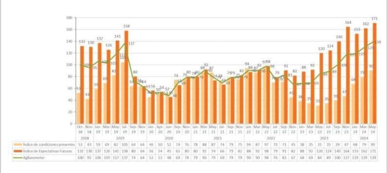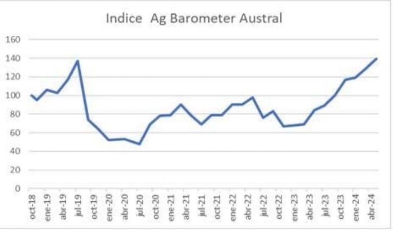 La última medición del Índice Ag Barometer Austral para los meses de mayo y junio de este año indica que se alcanzó el mayor índice de su historia con un valor de 139, superando la puntuación de 137 que se dio en julio de 2019, previo al proceso electoral que terminó con la llegada de Alberto Fernández a la presidencia.