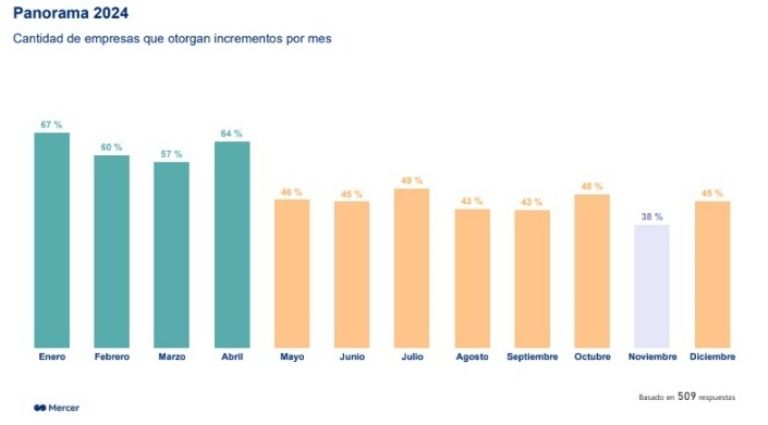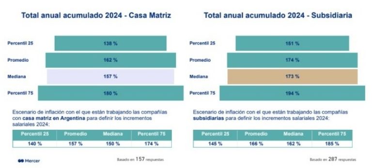 Según la última edición de la encuesta TISA de Mercer, consultora global líder en recursos humanos, las empresas argentinas prevén un presupuesto anual de incrementos salariales del 168%, lo que representa una caída de 12 puntos porcentuales respecto al informe de junio. De este modo, continúa la tendencia a la baja en los incrementos salariales proyectados por el sector privado, producto de la reducción de las expectativas inflacionarias.