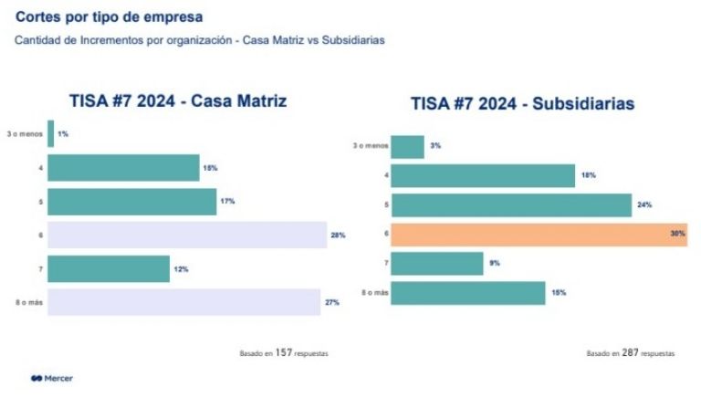 En este contexto, las compañías con casa matriz en Argentina reaccionaron de manera más ágil, ajustando los presupuestos de incrementos a la baja también a mayor velocidad. Hoy el presupuesto de las compañías nacionales se ubica un 16% por debajo de las compañías subsidiarias.