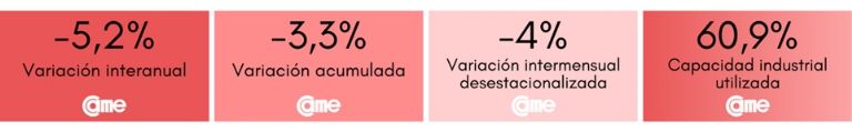 La producción se retrajo 5,2% anual en julio y 4% frente a junio en la medición sin estacionalidad. Para los siete meses del año acumula una caída de 3,3%. Las industrias operaron con el 60,9% de su capacidad instalada, muy por debajo de lo que fue el primer semestre, donde se promedió un 70%. El 24,5% de las empresas del sector manifestó problemas para pagar salarios en el mes.