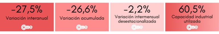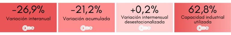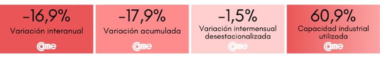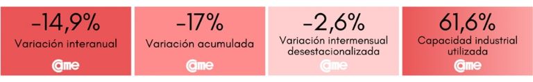 El sector registró caídas de 14,9% anual a precios constantes en julio y de 2,6% mensual. Para los siete meses del año acumula una baja de 17% anual. Las industrias operaron con el 61,6% de su capacidad instalada, niveles muy bajos para un sector que tradicionalmente ha sido más resistente a las fluctuaciones económicas. Las empresas están produciendo muy por debajo de su potencial. Esto afecta su rentabilidad y obliga a mayores esfuerzos para sostener el personal y las inversiones.