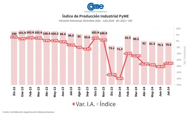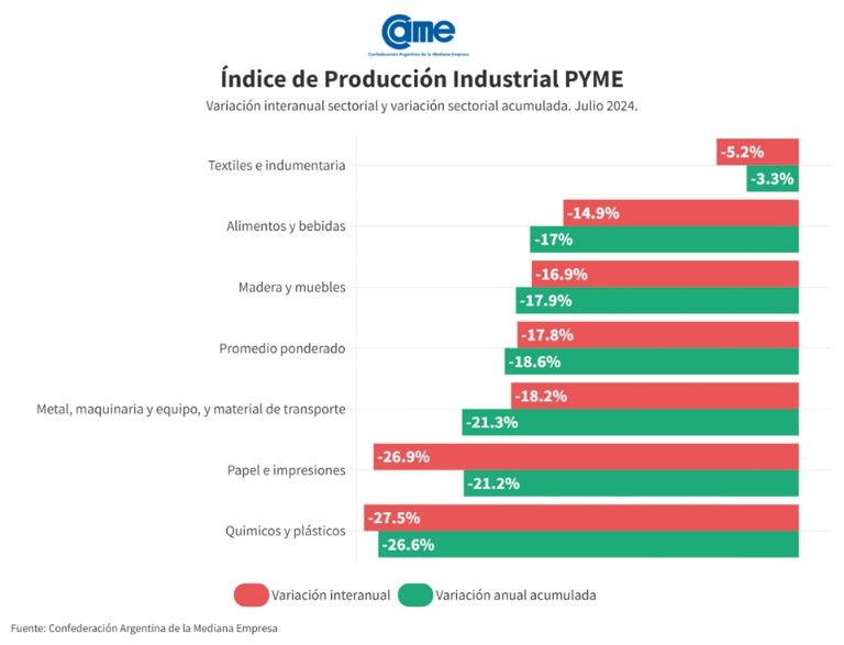 En la comparación mensual desestacionalizada la producción bajó 1,8%. Las pymes trabajaron en julio con el 60,6% de su capacidad instalada (en junio había sido el 60,1%). El 19,3% de las pequeñas y medianas empresas tuvo dificultades para pagar salarios.