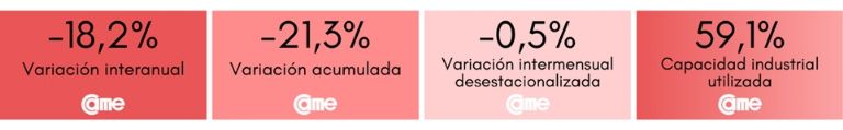 El sector tuvo una contracción anual de 18,2% en julio a precios constantes y de 0,5% en la comparación mensual desestacionalizada. En estos siete meses del año acumula una caída de 21,3% frente a los mismos meses de 2023. Las industrias operaron al 59,1% de su capacidad instalada y el 14,6% de los encuestados tuvo problemas para pagar salarios.